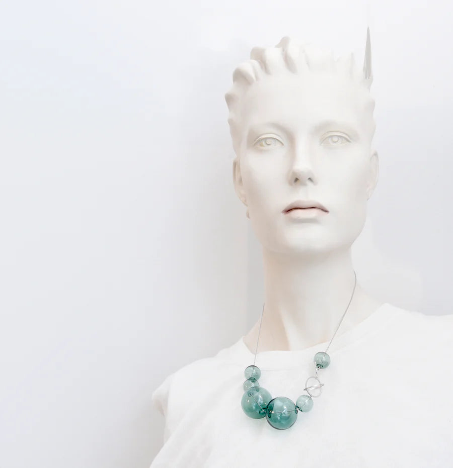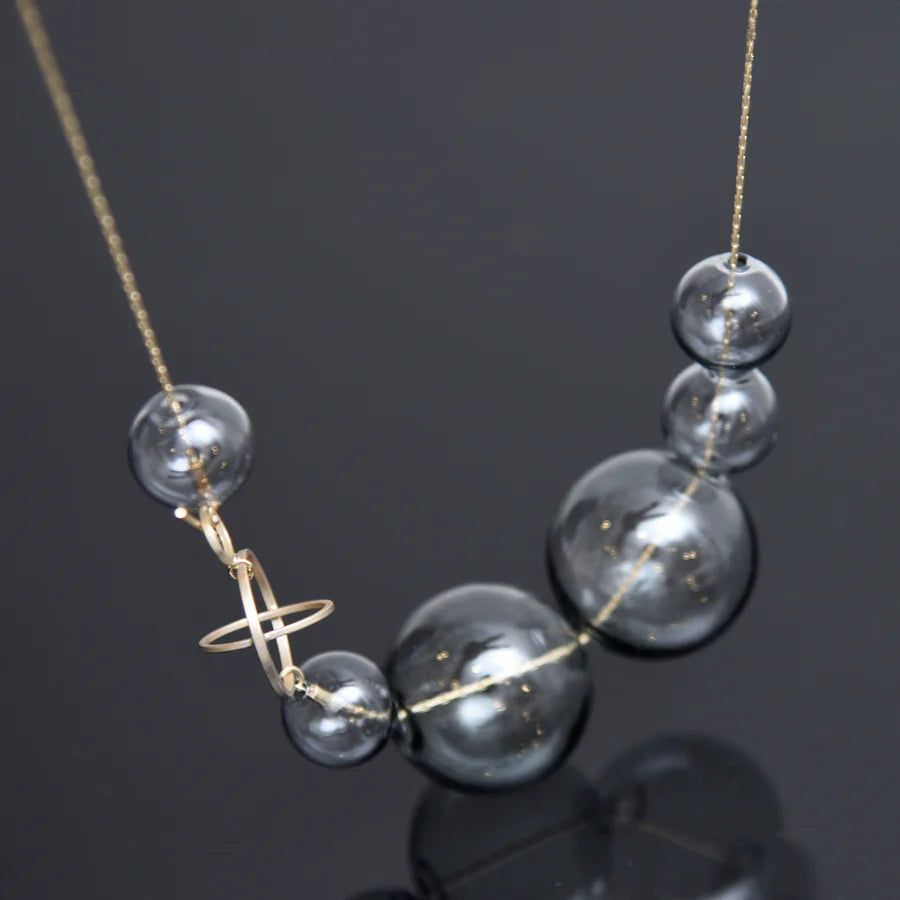 This piece is an exploration of circular forms, combining texture, weight, and colour. Held together with a simple toggle clasp, this short necklace is a bold and classy statement piece.