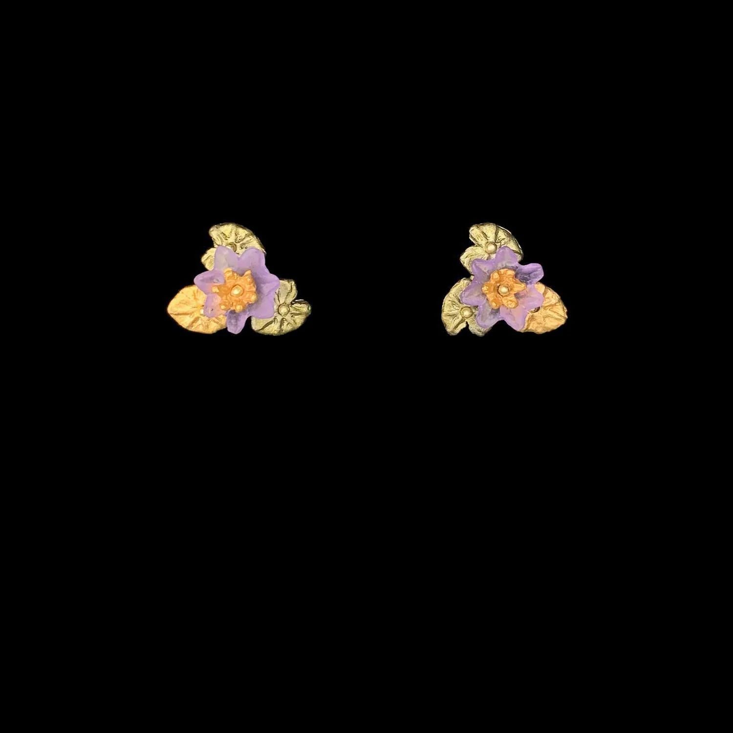 Materials: The Water Lilies Earrings are cast in bronze with a duo of mixed metal finishes - hand patina and 24K gold plating, accented with purple case glass flowers. The posts are 925 Sterling Silver.