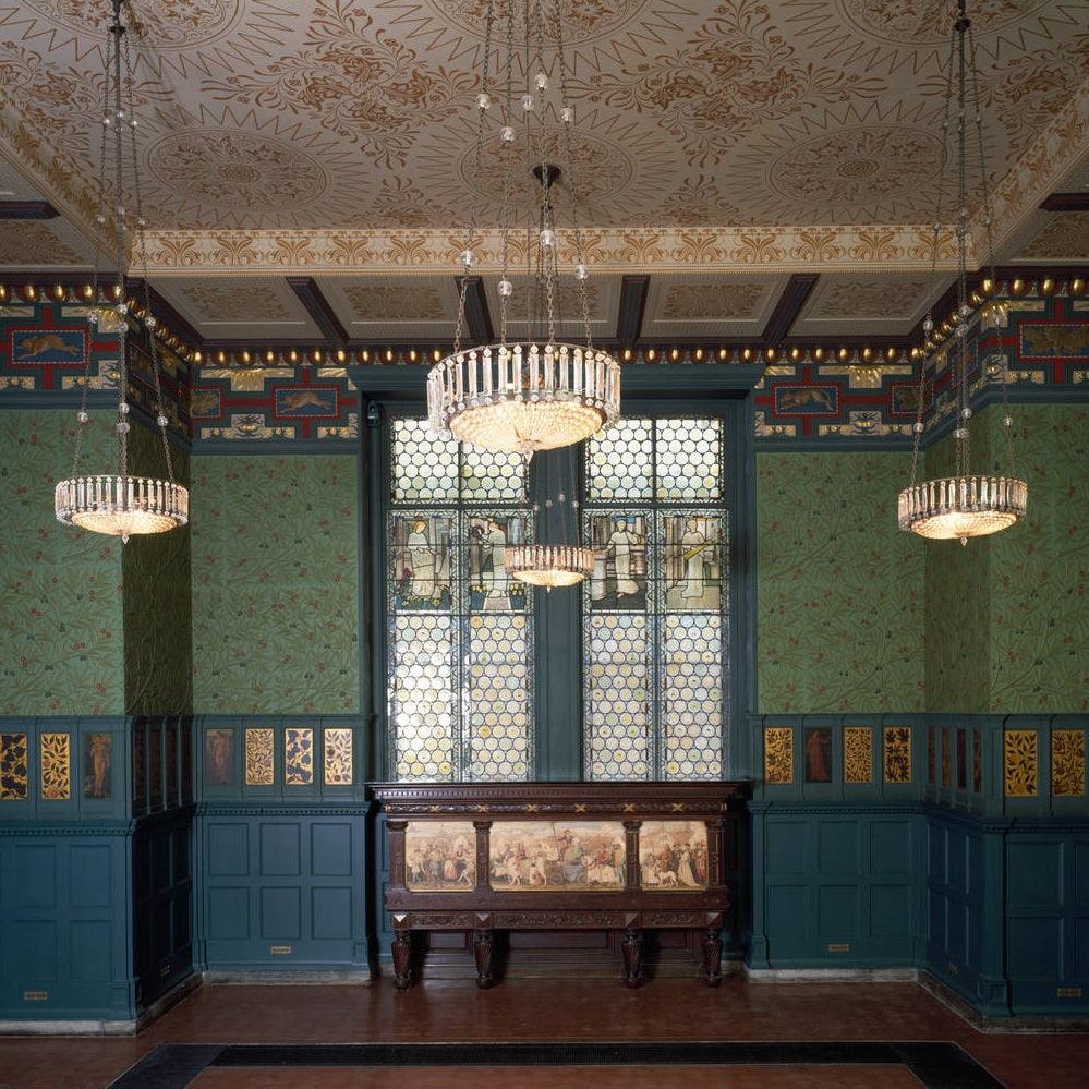 It was inspired by the V&A's Green Dining Room, the world's first museum cafe, and its fruit panels designed by the firm Morris, Marshall, Faulkner and co. in 1886. William Morris was a major influence on the Arts and Crafts Movement, which adopted many of his ideals on the value of hand craftmanship and the maintenance of truth and honesty in the materials of production. His medieval-inspired designs are noted for their remarkable renderings of interweaving flora and fauna, especially fruits and birds. The designs demonstrate depth of tones, richness in colours and graduation of tints.