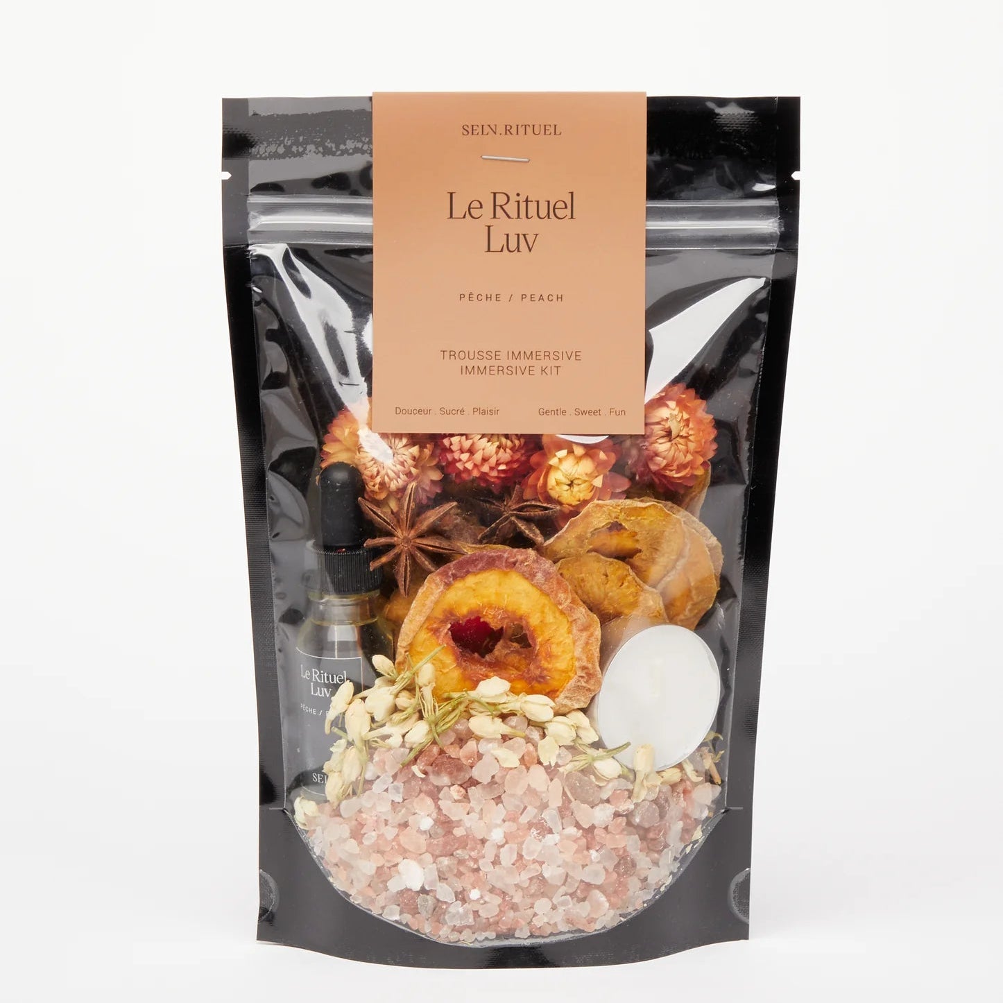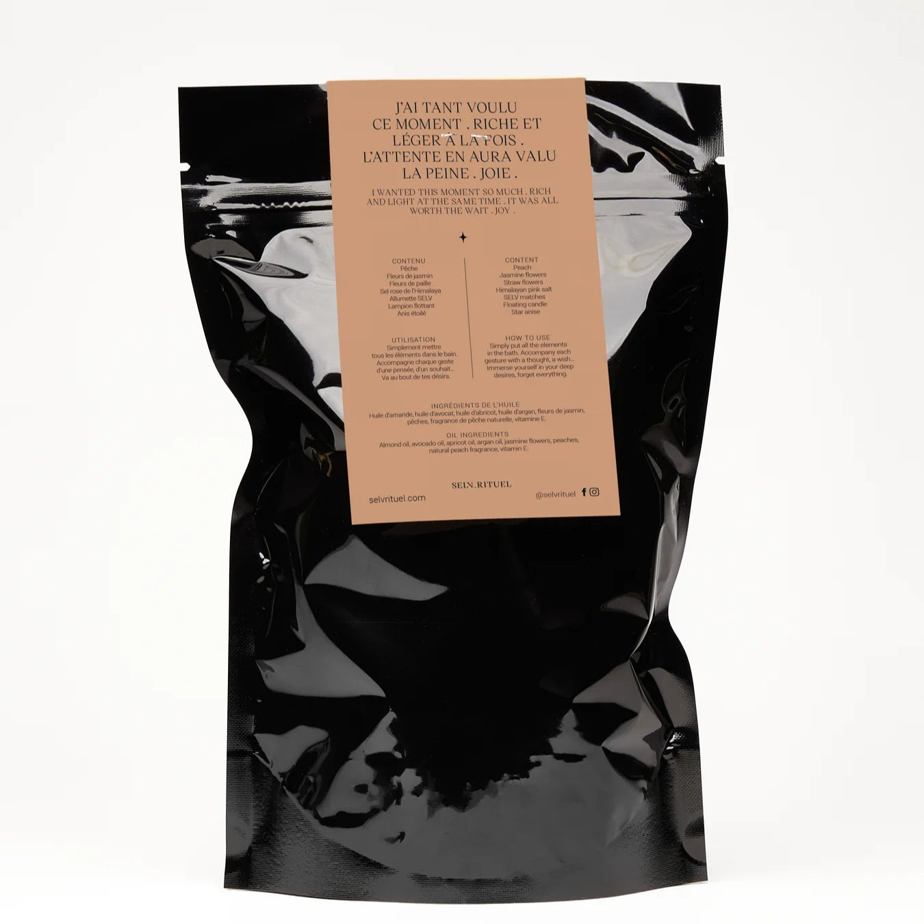 Himalayan pink salt, peaches, jasmine flowers, straw flowers, SELV matches, floating lantern, star anise, Rituel Luv bath and body oil (sweet almond oil, argan oil, avocado oil, apricot oil, natural peach fragrance and vitamins E).