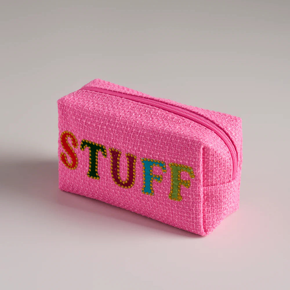 The Mara "Stuff" Zip Pouch is here to hold all your little must-haves with a wink and a smile. Made from a textured woven fabric, this compact zip pouch features colorful embroidered lettering that spells out “Stuff” loud and proud. With a secure top zipper and structured silhouette, it’s perfect for tossing in your tote or displaying on your vanity. Whether you’re stashing makeup, tech cords, or travel minis, this pouch keeps it cute and convenient.