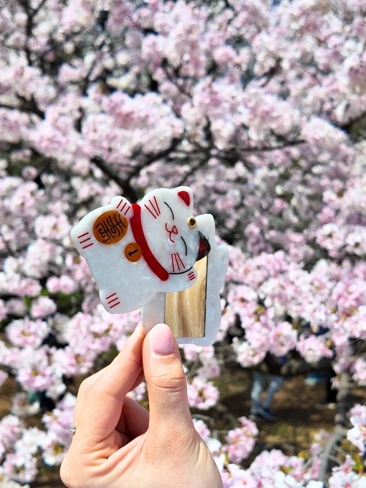 Each mirror features an original, hand-painted design created by Solar Eclipse artists. The Lucky Cat style is sculptural, playful, and full of personality—turning an everyday object into a signature accessory.